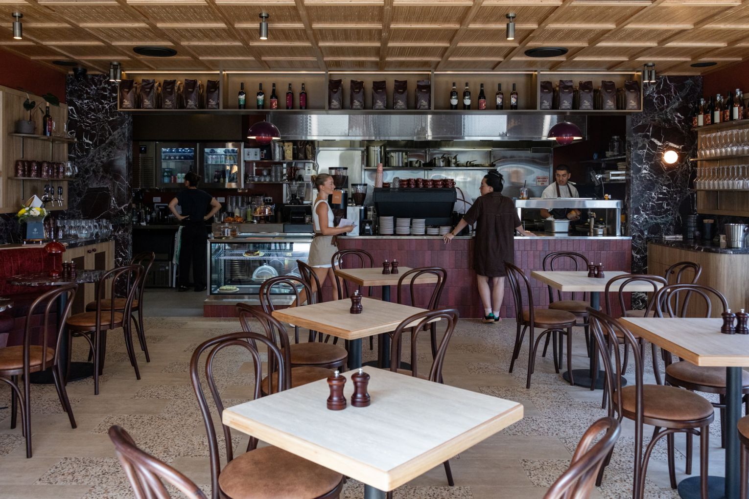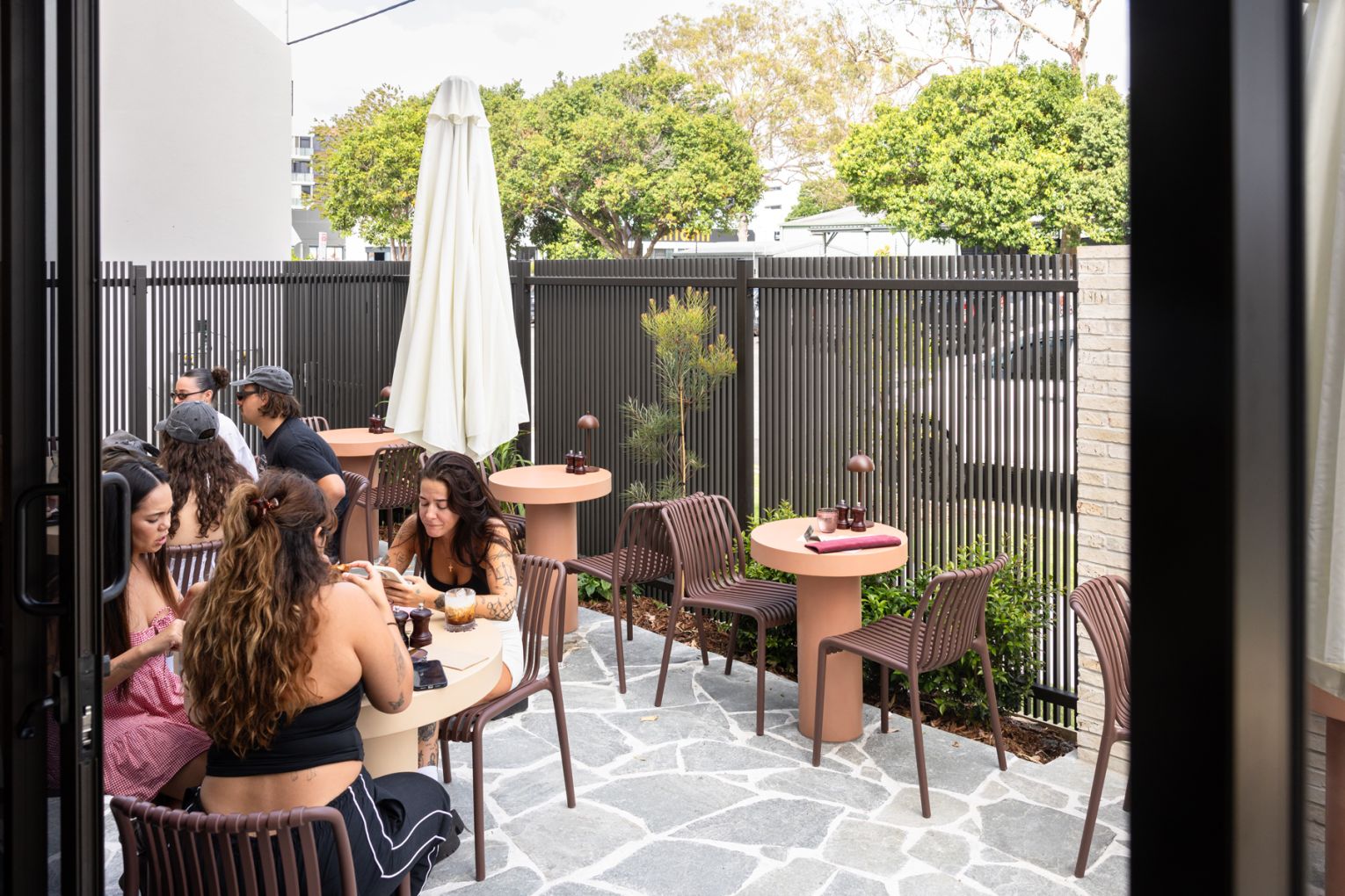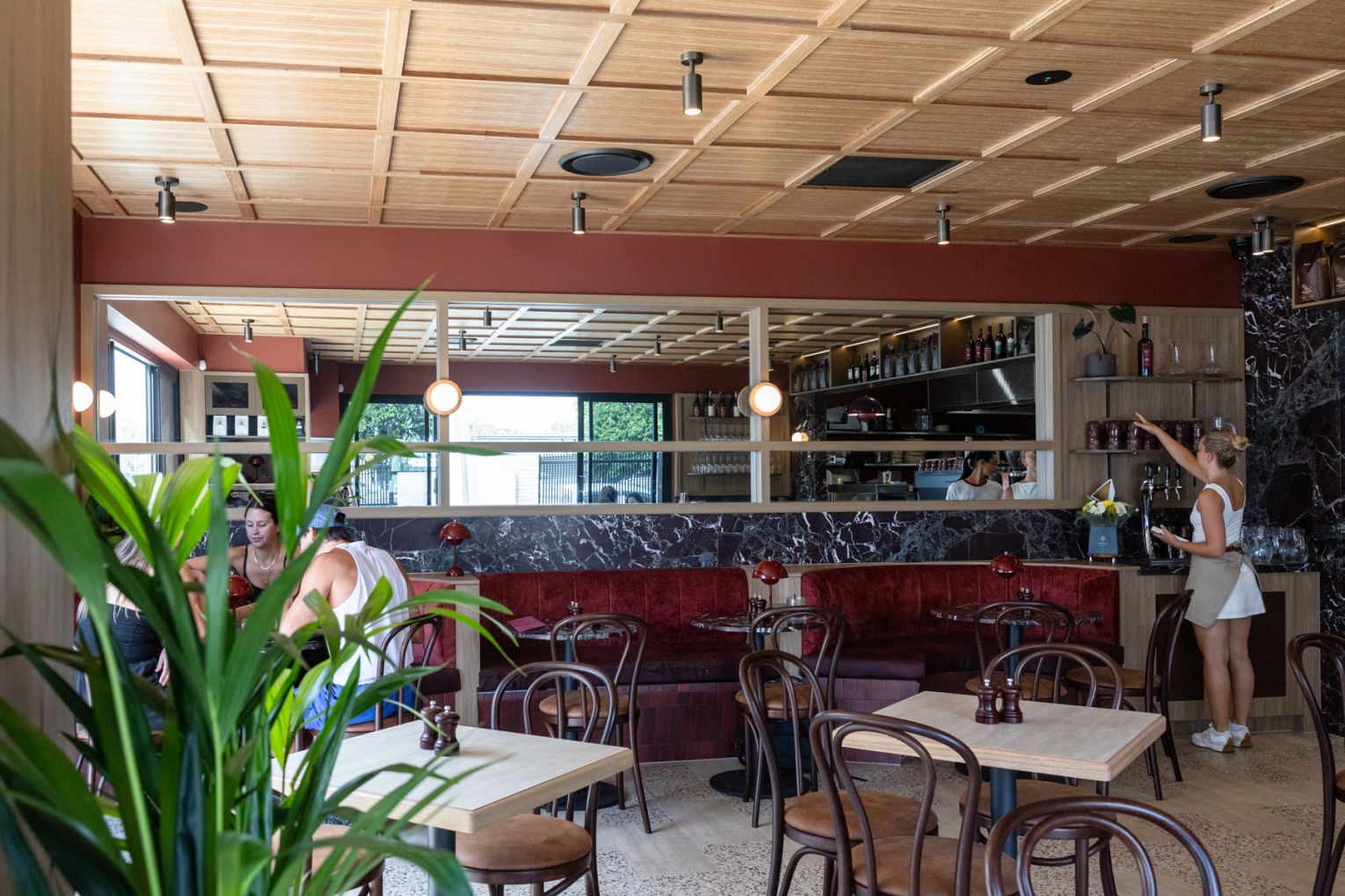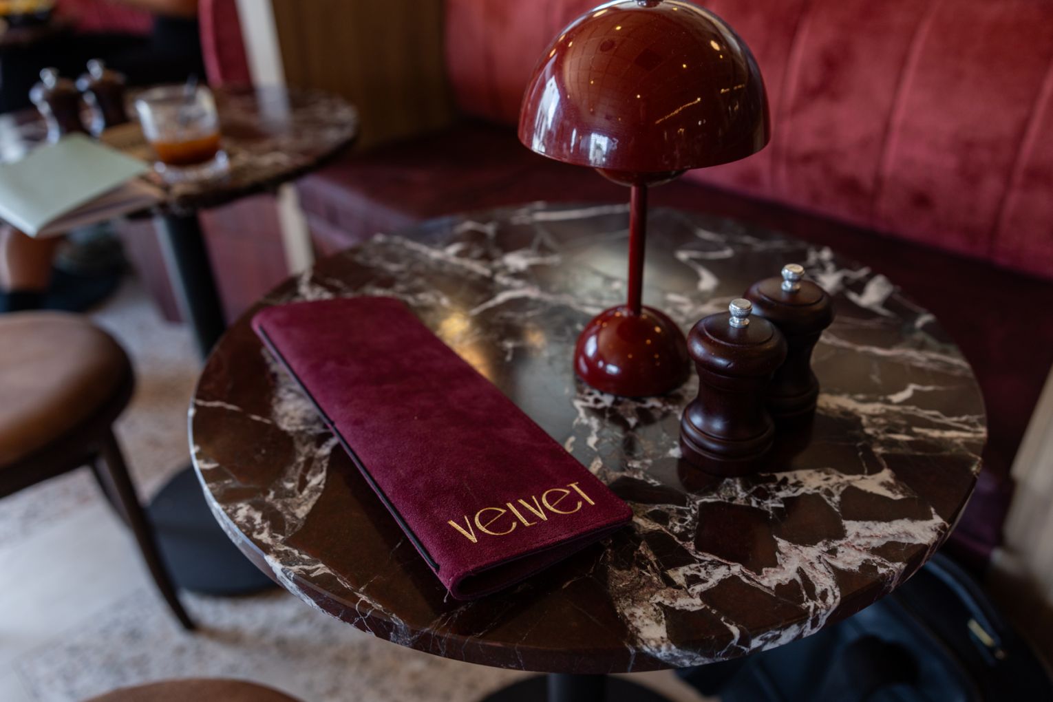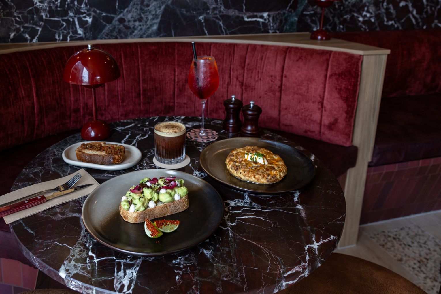 And that’s precisely what you will want to do. Designed by Studio Beck, with branding by Hover Creative Studio, the interiors are a study in mid-century luxury. Deep maroon tones, golden light, soft curves and lush velvet booths create a space that feels both sophisticated and intimate. Outside, a relaxed alfresco space dotted with intimate tables and one coveted group spot is perfect for coffee catch-ups and lingering in the fresh air.