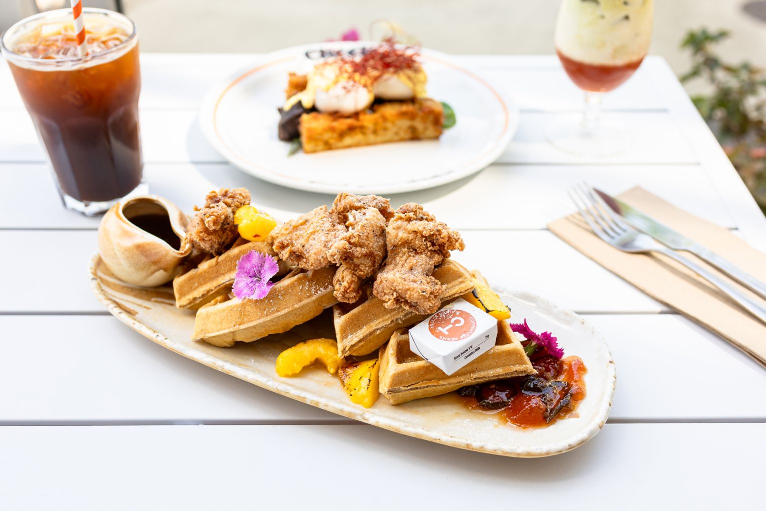 Those with a sweet tooth will gravitate toward the Peachy Panna Cotta – a Greek yoghurt creation that wobbles theatrically on the plate, topped with strawberry compote, house-made macadamia oat granola and seasonal fruit. The First Love waffles, generously adorned with strawberries, banana, biscuit crumble, vanilla gelato and melted chocolate, are as irresistible as they sound. Even the big breakfast has been given a glow-up, built with premium ingredients that turn the familiar into something deeply satisfying.