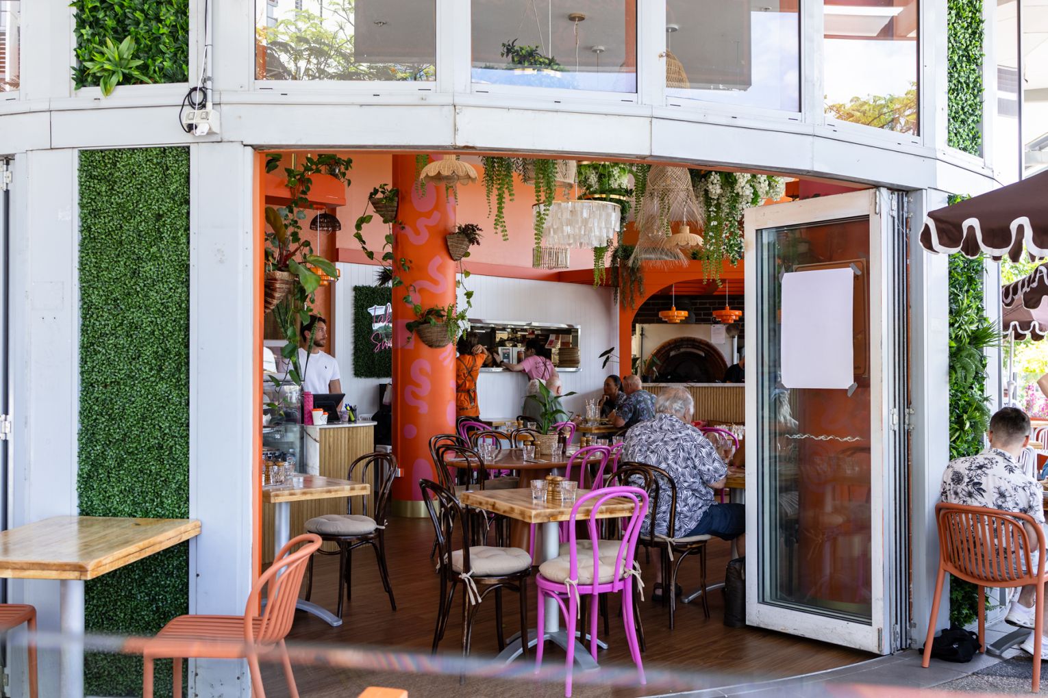Step inside and it’s immediately clear that Cheek is not your standard cafe fit-out. Natalie designed the interiors herself, layering curved steel and pops of bright peach and pink with handmade touches, timber floors, rattan lighting and lush greenery. Some of the chairs have even been hand-painted by her mum, Fay. It’s playful without being kitsch, modern without losing its warmth. Here, colour, texture and personality come together to create a deeply inviting space that feels both energising and grounding. Outside, nearly 100 seats spill into the sunshine, offering a breezy, relaxed vantage point for long coffees and leisurely breakfasts that roll into afternoon catch-ups.