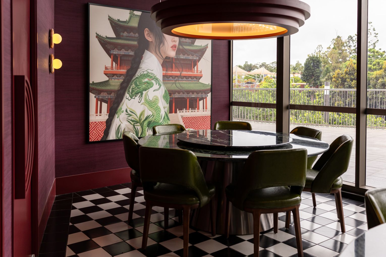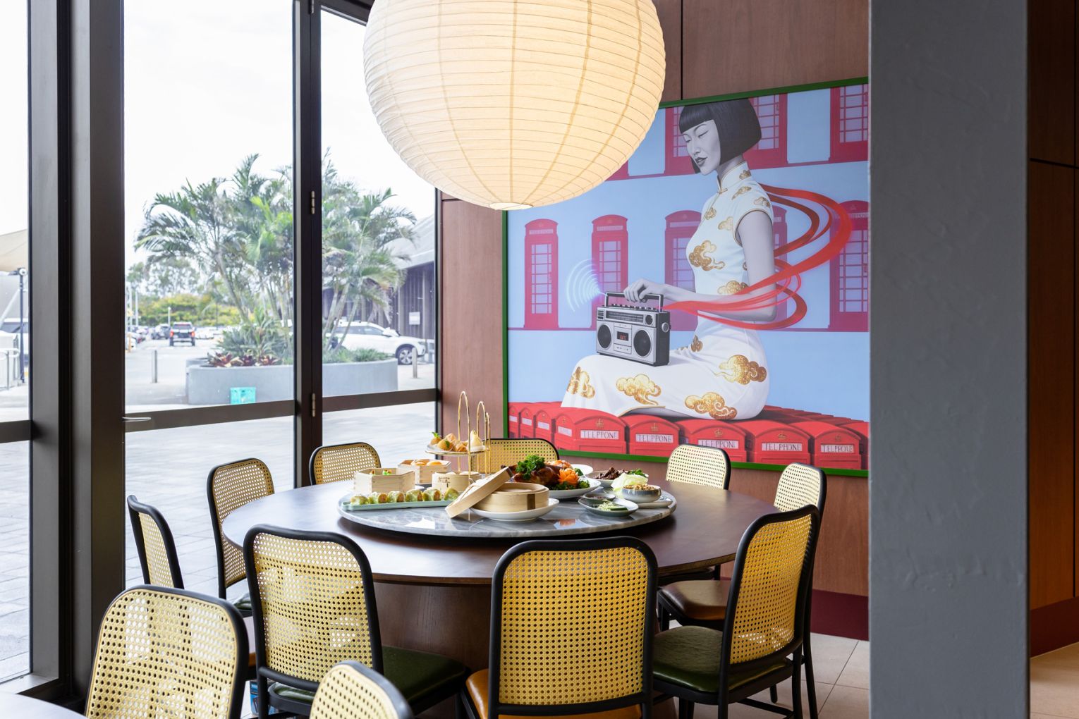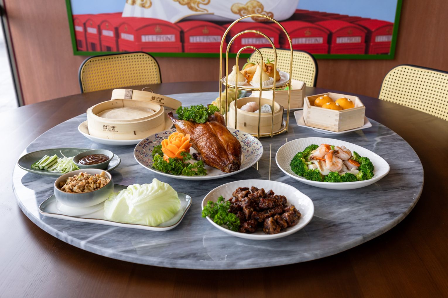 The space sets the tone from the moment you arrive. Designed by SPAN Design Studios, Jade Room is undeniably striking and leans into a modern, slightly nostalgic aesthetic – a nod to 1950s Shanghai layered with polished finishes and bold colour. Glossy marble tables made for sharing are paired with cane-backed chairs, green leather banquettes and warm timber panelling, anchored by oversized artworks that sit somewhere between retro poster and gallery piece. It’s a room that holds its own, equally suited to a midweek yum cha or a long, celebratory lunch.