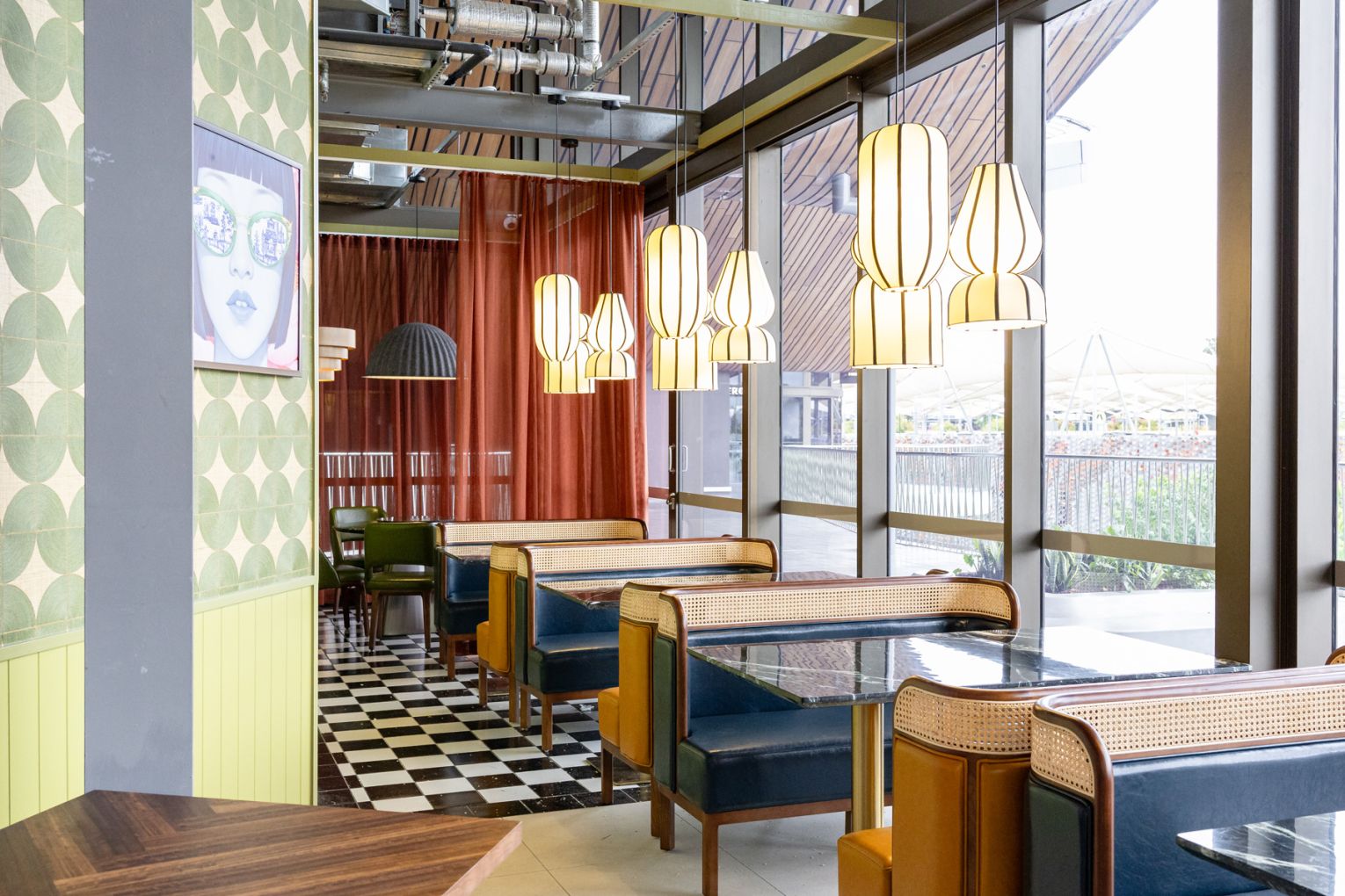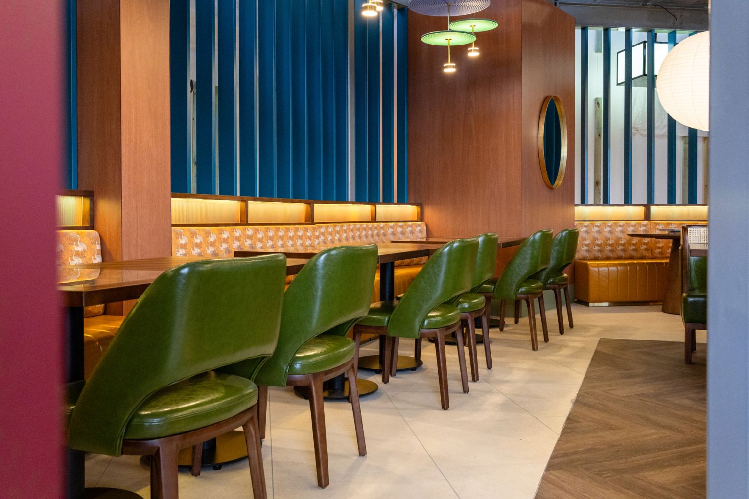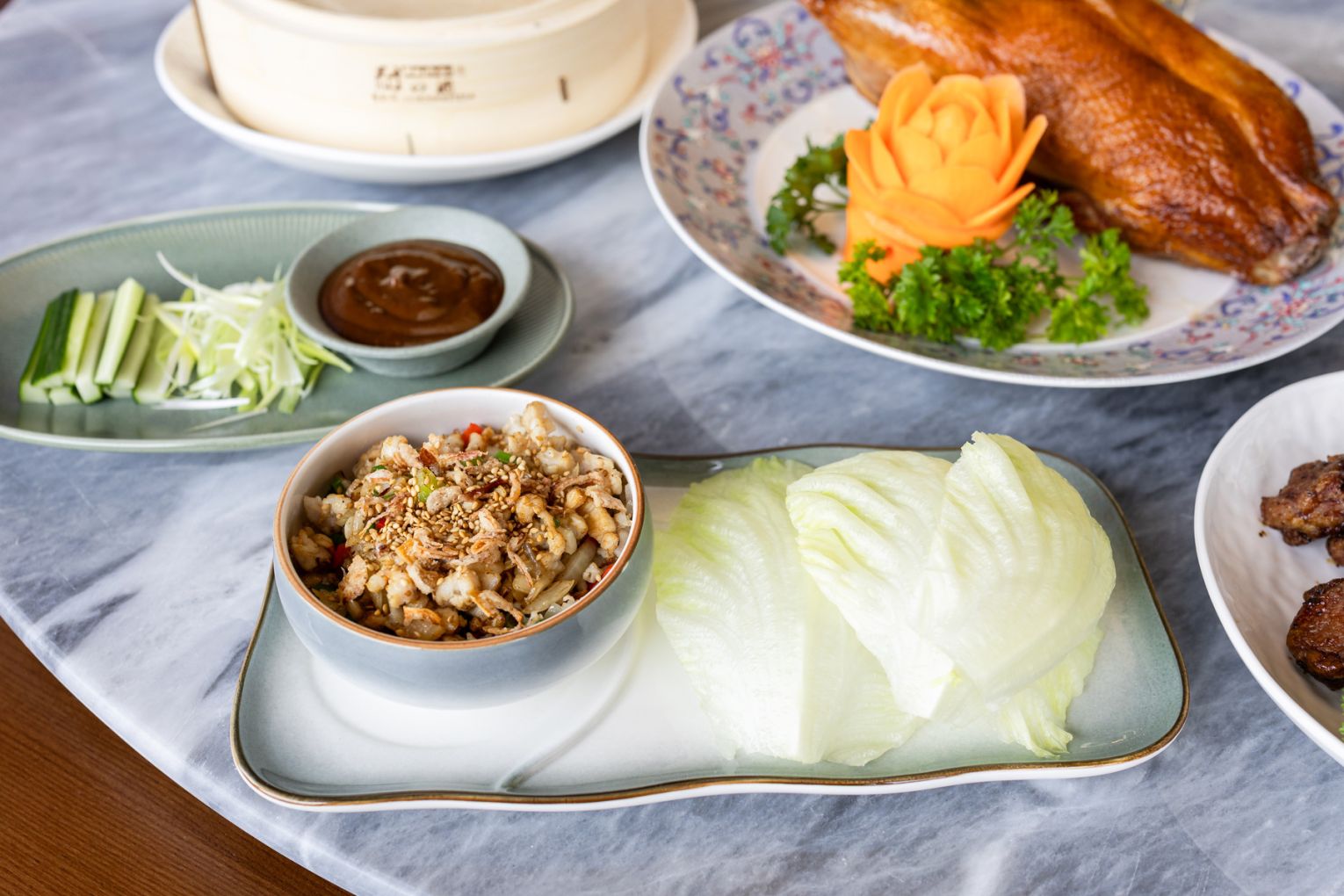 The space sets the tone from the moment you arrive. Designed by SPAN Design Studios, Jade Room is undeniably striking and leans into a modern, slightly nostalgic aesthetic – a nod to 1950s Shanghai layered with polished finishes and bold colour. Glossy marble tables made for sharing are paired with cane-backed chairs, green leather banquettes and warm timber panelling, anchored by oversized artworks that sit somewhere between retro poster and gallery piece. It’s a room that holds its own, equally suited to a midweek yum cha or a long, celebratory lunch.