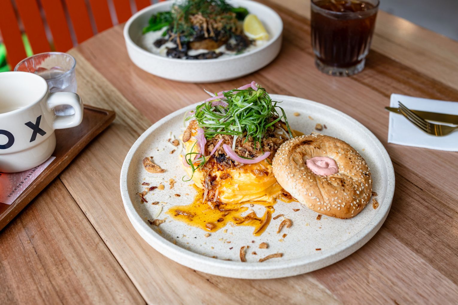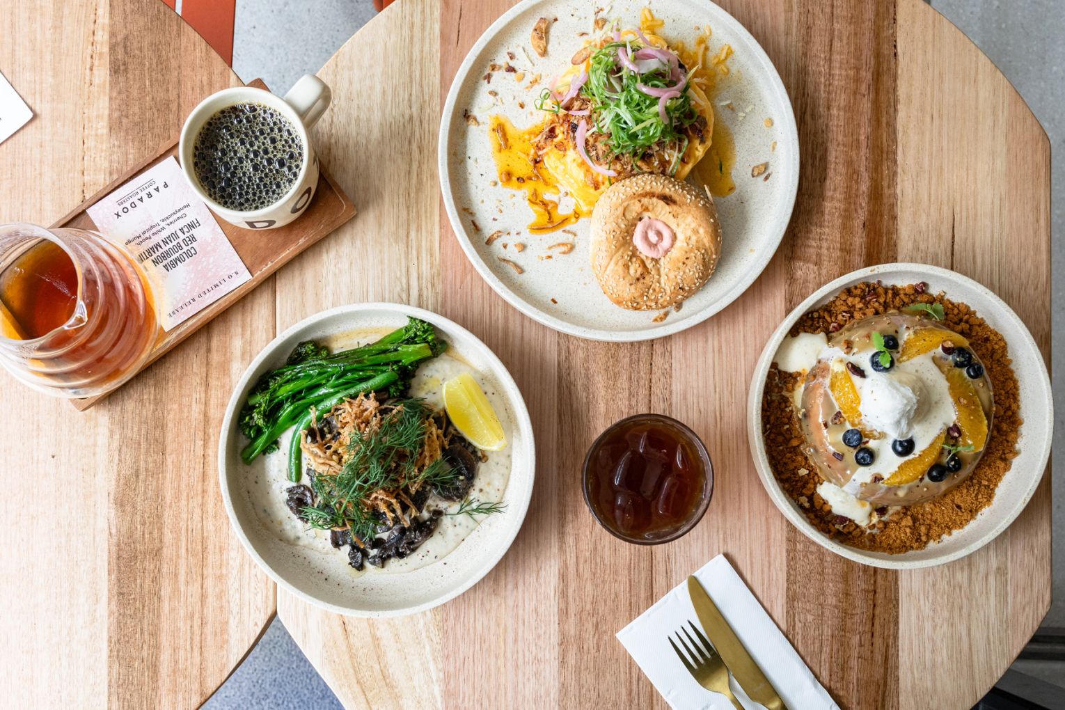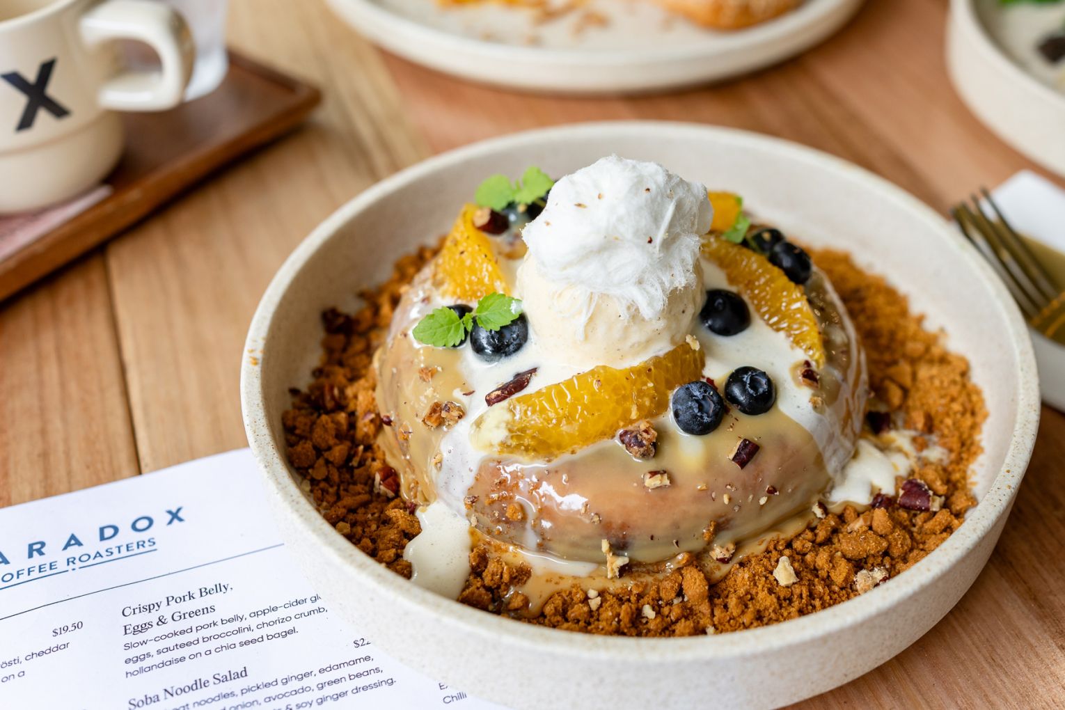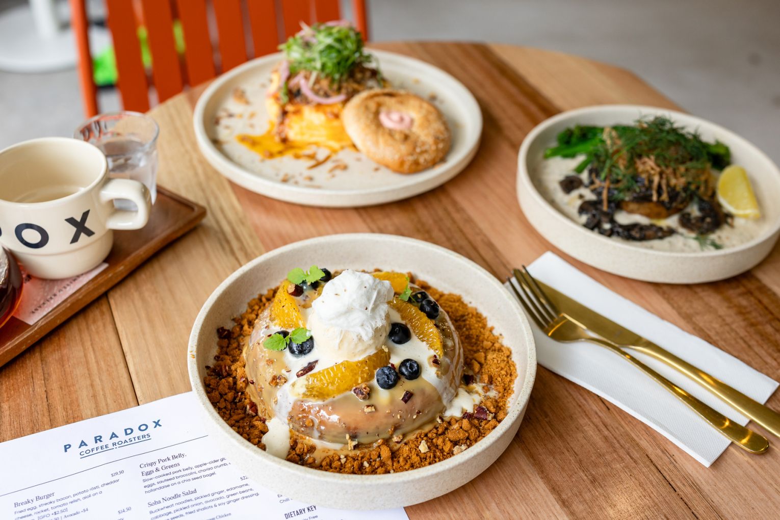 The chilli scrambled eggs deliver a punch of flavour, layered with fermented chilli labneh, crispy shallots, chilli oil, pickled onion and herbs. The Paradox miso mushroom has quickly become a favourite – served on a crisp lentil cake with miso-glazed mushrooms, crispy enoki, whipped white bean and charred greens. For something on the sweeter side, the dulce de leche buttermilk hotcakes arrive topped with vanilla bean ice-cream, Biscoff crumb, berries, burnt orange, toasted pecans and Persian floss.