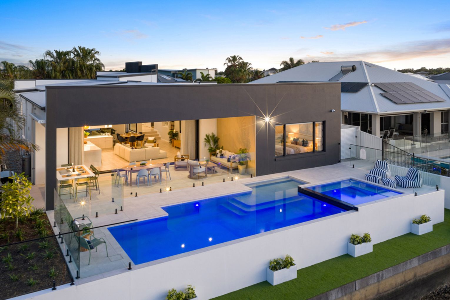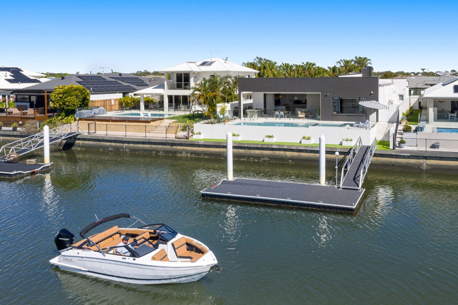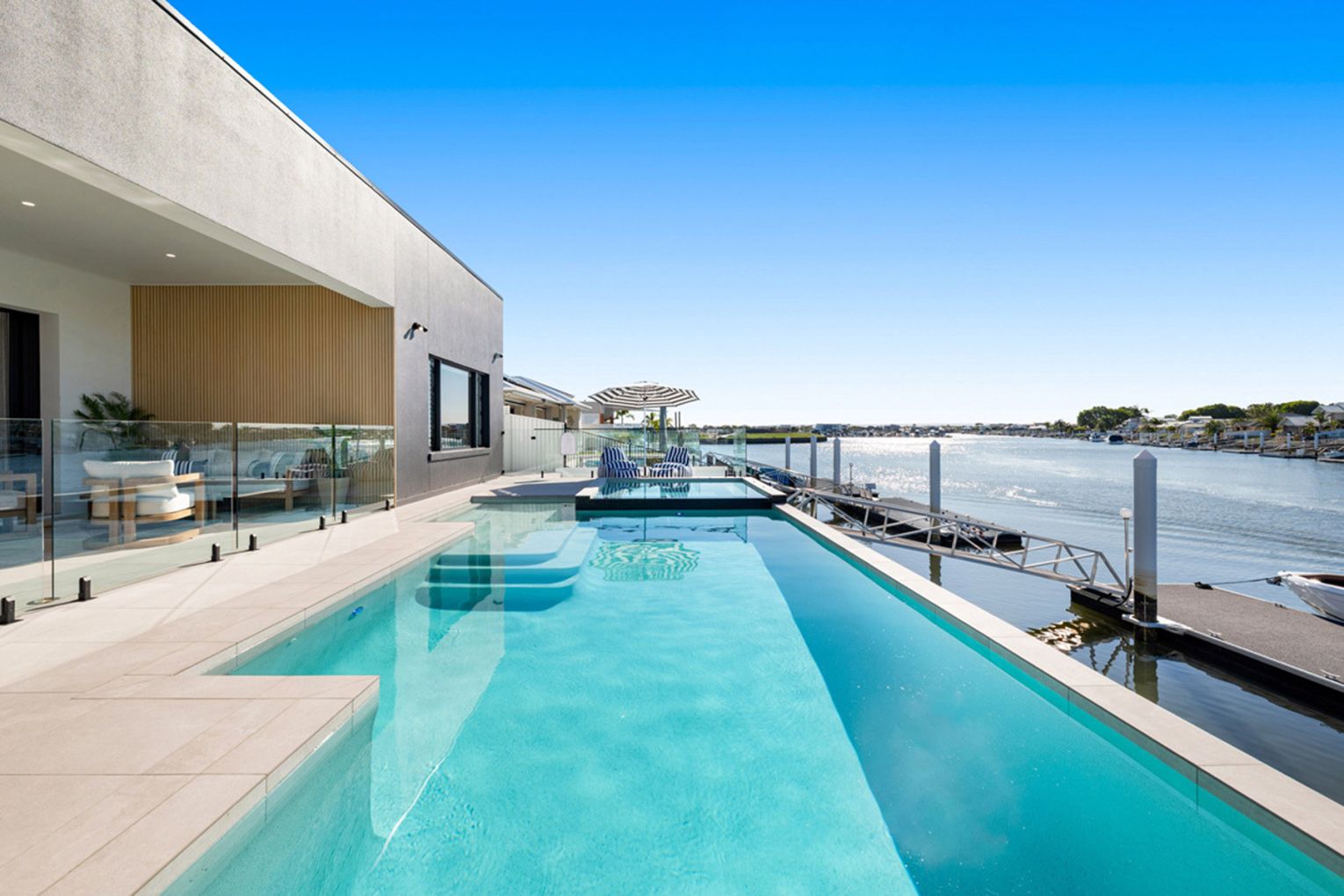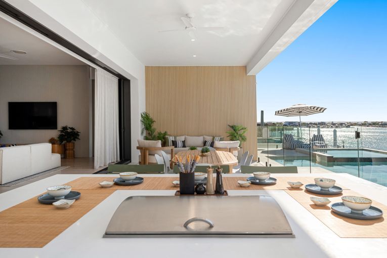 Outside, the home embraces everything people love about island living, making the most of its spectacular 20-metre north-west water frontage. The alfresco area comes equipped with a gourmet outdoor kitchen – including a barbecue and teppanyaki grill – creating the perfect setting for sun-soaked long lunches and dinners under the stars. A sparkling saltwater pool and spa invite slow afternoons in the sun, while the private pontoon and state-of-the-art dry-dock system offer a seamless launchpad for days spent on the water.